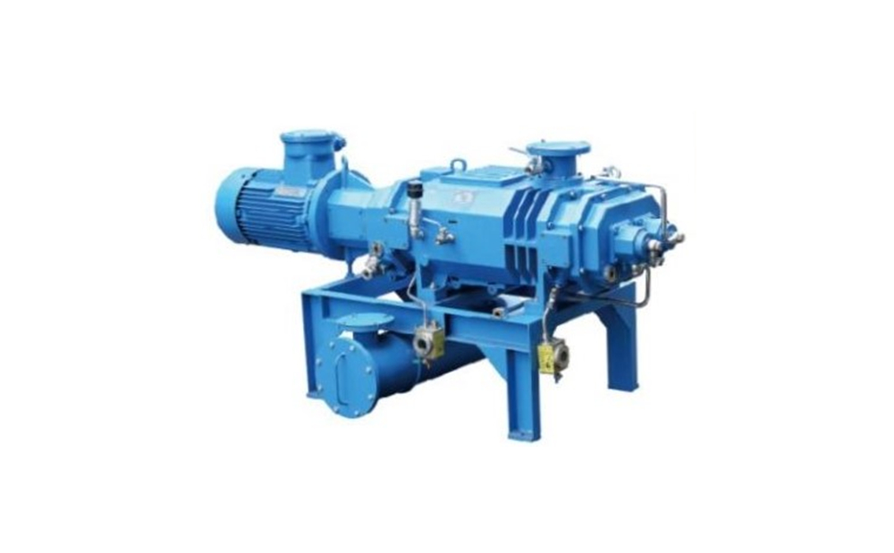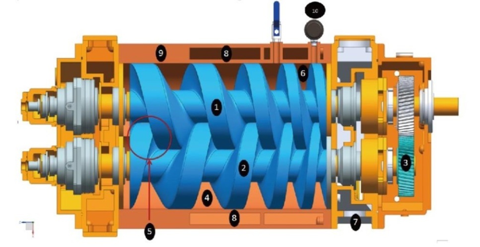 干式螺桿真空泵的工作過(guò)程可分為吸氣、壓縮和排氣三個(gè)過(guò)程。如圖所示,干式螺桿真空泵內(nèi)裝有一對(duì)平行的螺旋狀的轉(zhuǎn)子(1和2),其中一件轉(zhuǎn)子的旋轉(zhuǎn)方向?yàn)橛倚硪患樽笮蓚€(gè)轉(zhuǎn)子在泵體(9)內(nèi)通過(guò)一對(duì)齒輪(3)保持同步反向旋轉(zhuǎn)。轉(zhuǎn)子與轉(zhuǎn)子之間、轉(zhuǎn)子與泵體之間沒(méi)有磨擦且保持一定的間隙,兩個(gè)轉(zhuǎn)子與泵體之間形成了密封腔(4),密封腔的個(gè)數(shù)等于轉(zhuǎn)子的螺旋圈數(shù)。兩個(gè)轉(zhuǎn)子在按圖中方向旋轉(zhuǎn)時(shí),與吸氣口(5)相連的密封腔的空間逐漸變大,氣體被吸入并被傳送到排氣側(cè),排氣側(cè)的密封腔(6)空間在旋轉(zhuǎn)過(guò)程中逐漸變小,氣體被壓縮到排氣口(7)。長(zhǎng)時(shí)間運(yùn)轉(zhuǎn)時(shí)需向泵體及端蓋的夾套(8)內(nèi)通入適量的冷卻水以對(duì)泵進(jìn)行冷卻。因壓縮熱主要在排氣側(cè)(6)產(chǎn)生,為了充分冷卻轉(zhuǎn)子,在多數(shù)工況下可以將適量的空氣或其它合適的氣體通過(guò)摻氣口(10)導(dǎo)入泵腔內(nèi)。